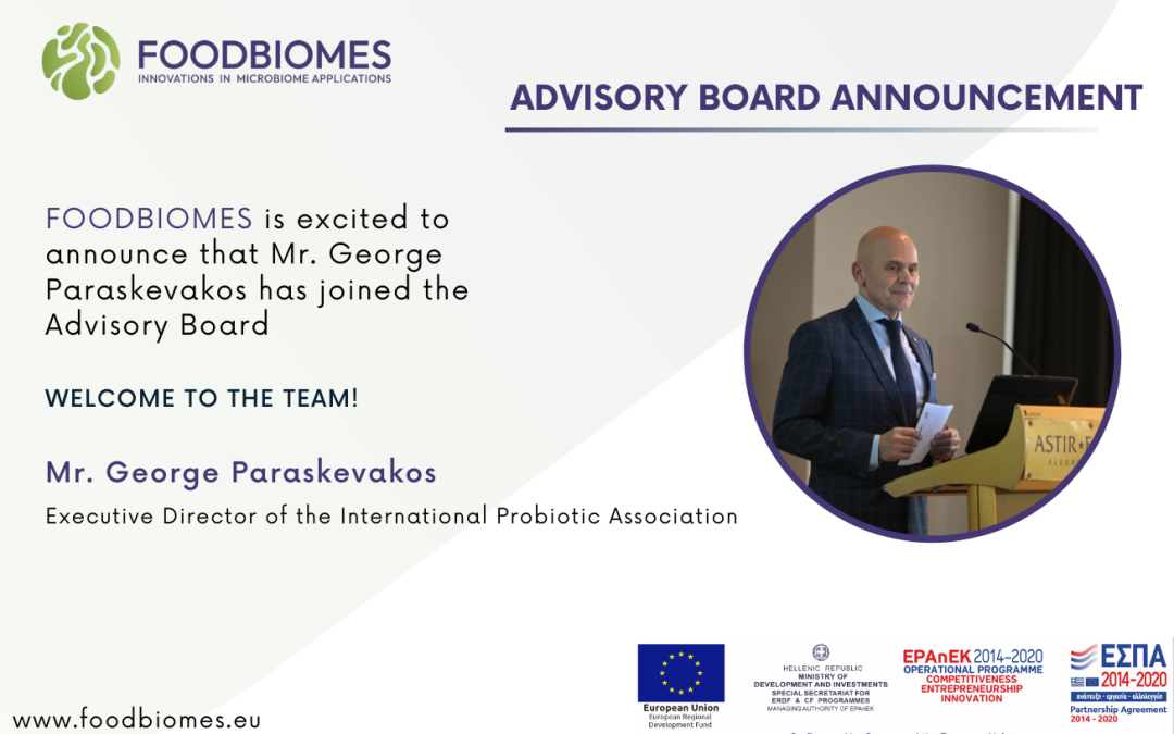 We have the pleasure to announce that George Paraskevakos, Executive Director of the International Probiotic Association (IPA), has joined the Advisory Board of FOODBIOMES.